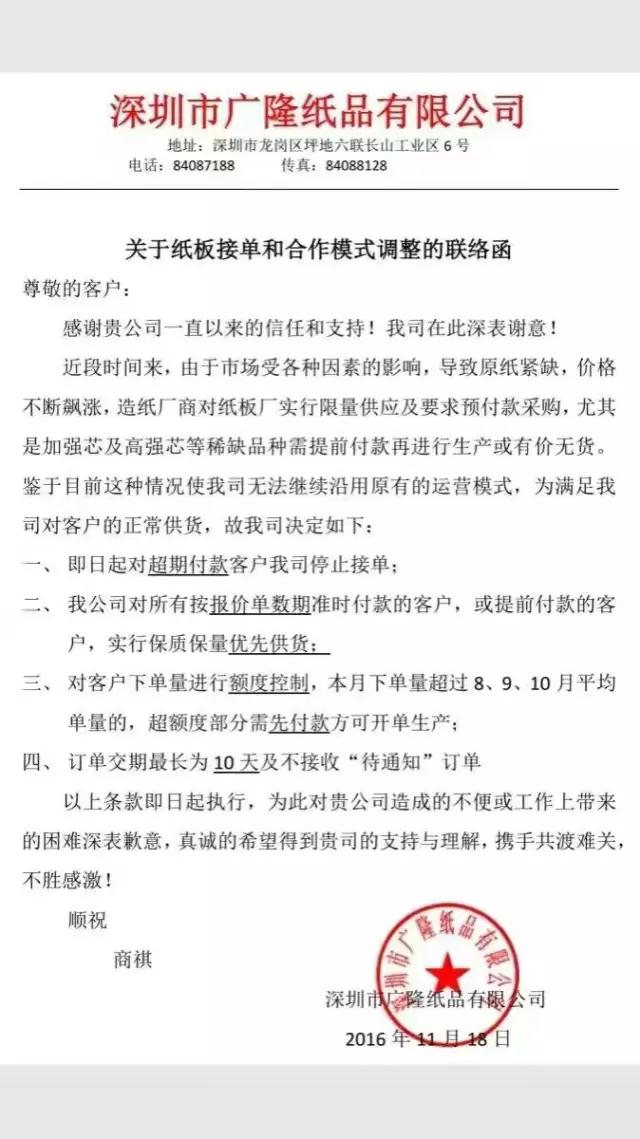 11月19号我不知道别的地方,我知道深圳的原材料紙張漲瘋瞭,一時間所有的包裝行業印刷行業朋友圈都在轉發,我開始憤怒瞭這是要逼著印刷廠都關門嗎?對你們有好處嗎原材料的廠商,你們不想讓我們接單瞭想讓我們斷糧食瞭,沒有紙的日子特别難熬,漫天飛的漲價聯絡單與限産單通知,沒有紙的日子特别難熬,爲什麽說紙價瘋漲也沒人管?並不是要故意制造恐慌,也不是要哄擡紙價。就幾天時間公司接到好幾張漲價的通知單,我說如果你告訴客戶他們肯定不願加他的價,這樣的話我們印刷廠就不好接單不好操作,你不可能一一的爲你的客戶去解釋吧,就算他們願意聽我們也沒那麽多時間,換個角度如果印刷廠集體罷工的話,那你們紙廠還有什麽資格是合夥漲價,本身今年明年印刷行業都是很困難的,這個雪上加霜的時候還漲價都不知道報的什麽心态 。反正我是有圖有真相的等會有同行的可以看看,大家互相轉發抵制他們原材料漲價。深圳市博霖印刷感謝一路支持的客戶和供應商們特殊時候換位思考謝謝。