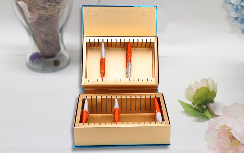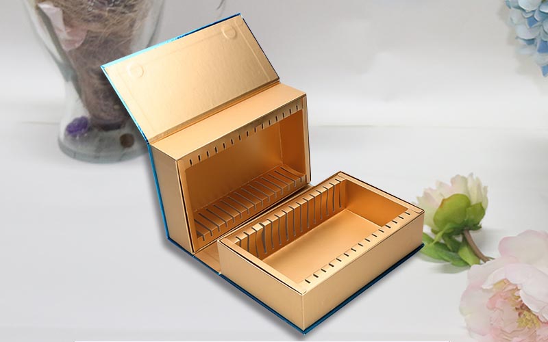 1.材質:盒子面紙採用金卡紙專色印刷,單面啞膜表面燙金,裱1300G雙灰闆,盒子内襯裱金卡紙,,内盒用金卡紙裱1200G雙灰闆,盒型爲雙層翻蓋盒,整款盒子手工制作。