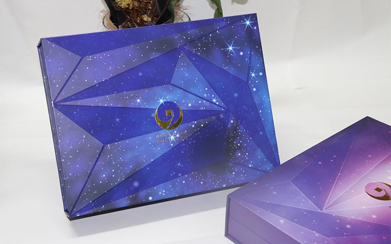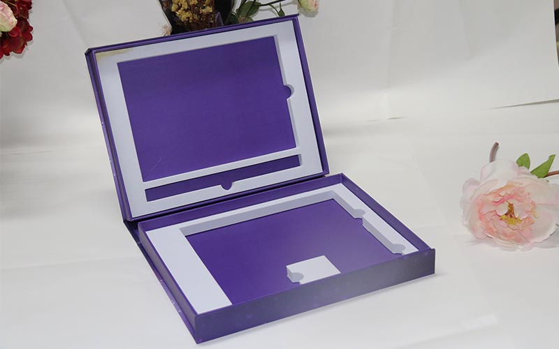 1.材質:盒子面紙採用157G銅版紙,表面彩色印刷,線條UV光油,LOGO文字燙金。裱1500G雙灰闆,盒子爲藍,紫兩個顔色,内托爲白色内盒裏面全部貼滿彩紙,盒型爲上下翻蓋盒磁鐵要有吸度。