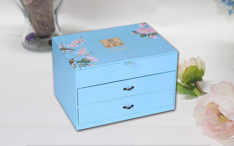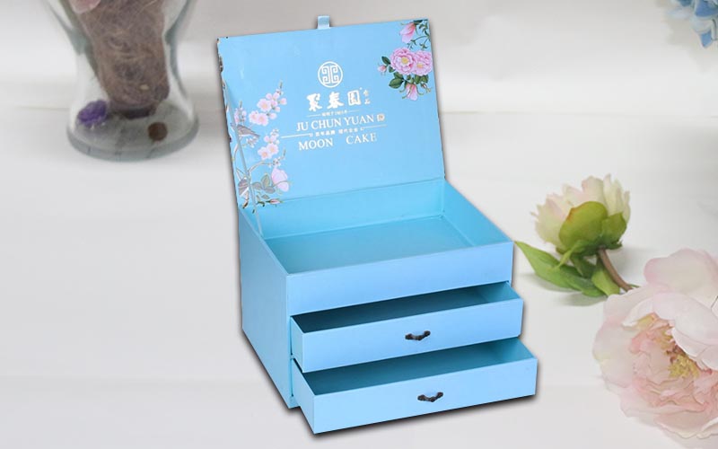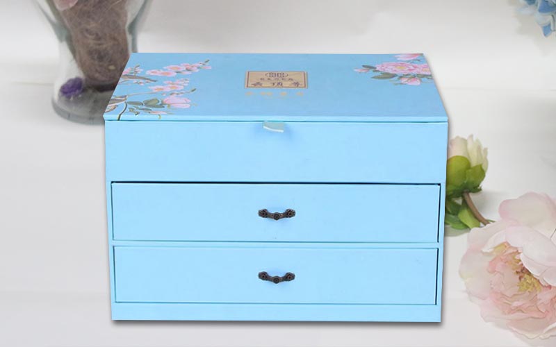 1.材質:盒子面紙用157G銅版紙,單面彩色印刷,過觸感膜,裱1800G雙灰闆,盒子結構爲翻蓋抽屜盒,兩層抽屜盒裝複古的手拉扣,盒子裏面也是用一樣的材質工藝,整款盒子結構複雜都是手工制作 。