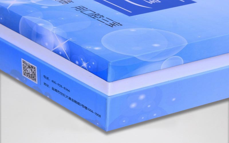 1.材質:盒子面紙採用銅版紙單面彩色印刷,啞膜,裱1300G單白闆,這款翻蓋盒中間加瞭内圍條,内圍條爲瞭更好地卡住盒子,内托用珍珠棉裱一層珍珠白綢布,整款盒子手工制作。