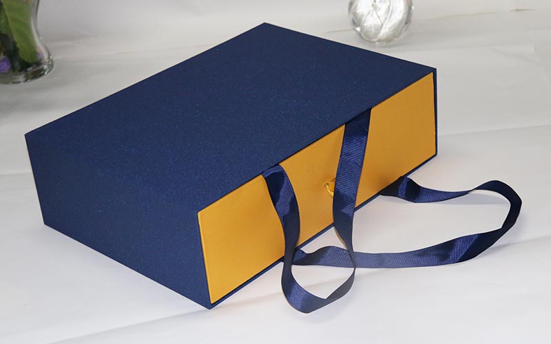 1.材質:盒子面紙用藍色磨砂特種紙,内盒也在用金黃色特種紙,裱1500G雙灰闆成品粘兩條絲帶方便客戶攜帶貨物,切記貨物太重的不能這樣。不然到時候繩子斷開産品就會受損,盒子比較大整款盒子都是手工制作。