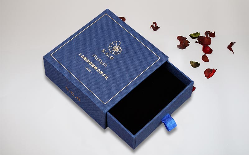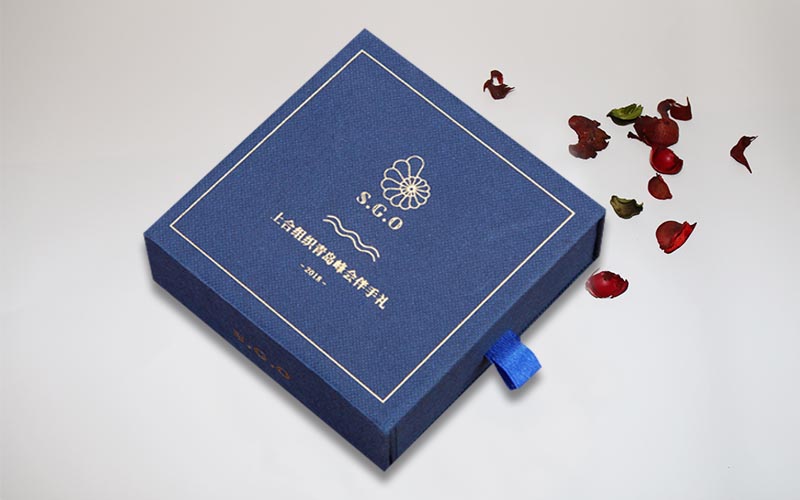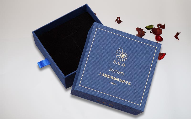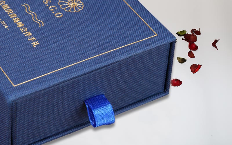 1.材質:盒子面紙採用小石頭紋的藍色特種紙 ,盒子表面文字LOGO燙金色,裱1200G單白闆,整體盒子爲抽屜盒性,抽拉的地方裝藍色的絲帶。整款盒子手工制作。