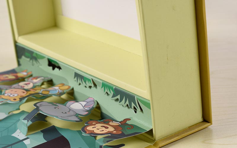1.材質:盒子材質用157G銅版紙單面彩色印刷,單面覆亞膜,裱1500G雙灰闆,内托用350G單粉卡紙印刷裱350G單粉卡紙,裱内襯在襯紙上貼一張啤好模型立體的動物卡片,手工粘好定位,整款盒子手工制作成品。