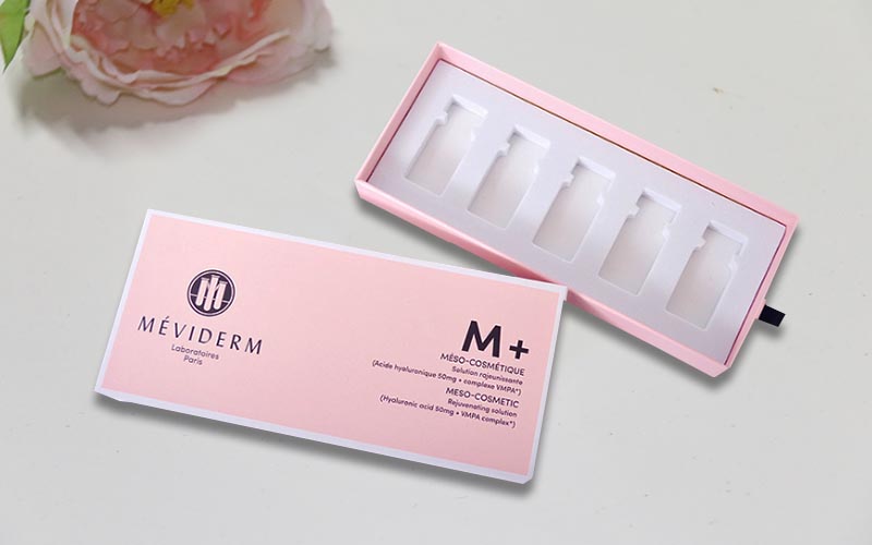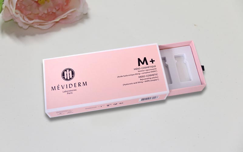1.材質:157G銅版紙,單面彩色印刷,覆觸感膜,裱1200G單白,盒子内托用白色植絨EVA開槽位放産品,盒型爲抽屜盒手工制作粘黑色抽拉絲帶