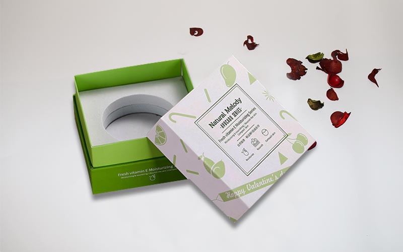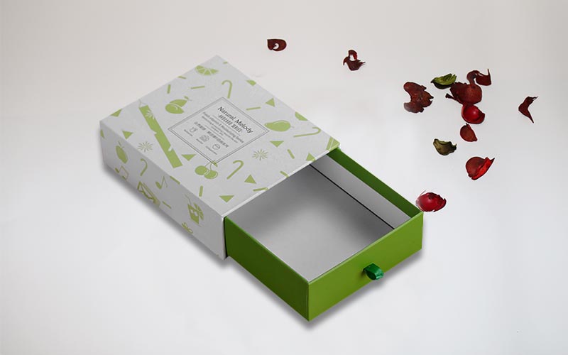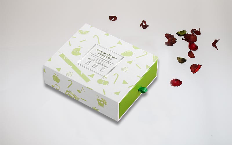 1.材質 :盒子採用157G銅版紙彩色印刷單面啞膜,小圖片UV光油,裱1200G單白闆,盒子整體爲淺綠色,抽屜盒型粘綠色絲帶盒子,裏面内托爲白色A級材質無味道。