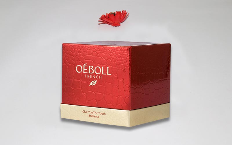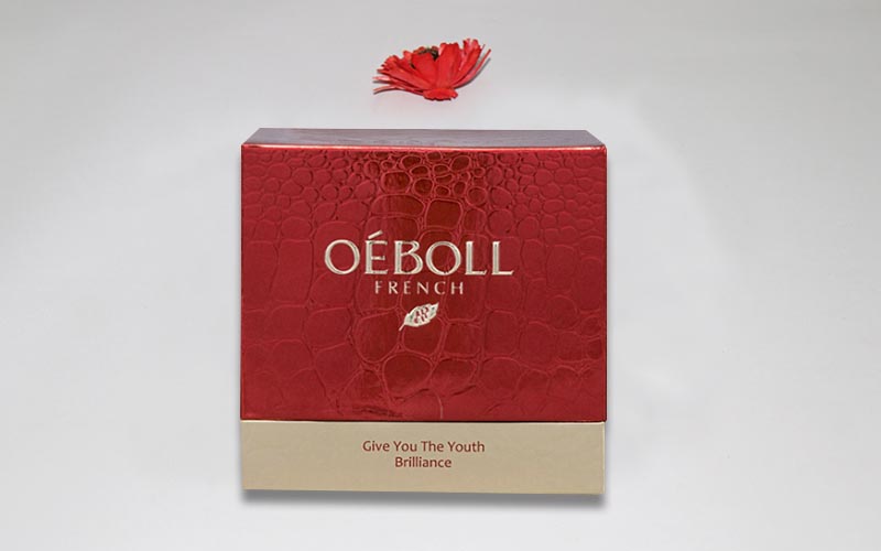 1.材質 :單隻裝美白霜包裝盒,盒子面紙採用金卡紙,專紅色印刷,整個盒子都要做鳄魚紋路的壓紋工藝,單面覆光膜,裱1200G雙灰闆,盒子底部内托用白色EVA包金卡紙固定産品。盒子上下天地盒,手工制作成品。