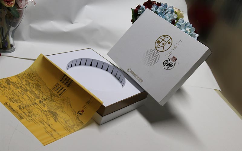 1.材質:盒子面紙採用白色名仕高檔珠光紙,正面絲印四色機印刷+燙黃金,裱1500G雙灰闆+中間金色特種紙内圍條,内托白色坑紙産品上面覆蓋一層金黃色牛油紙單色印刷,整體盒子外觀在加一條中國紅色橡皮筋 。