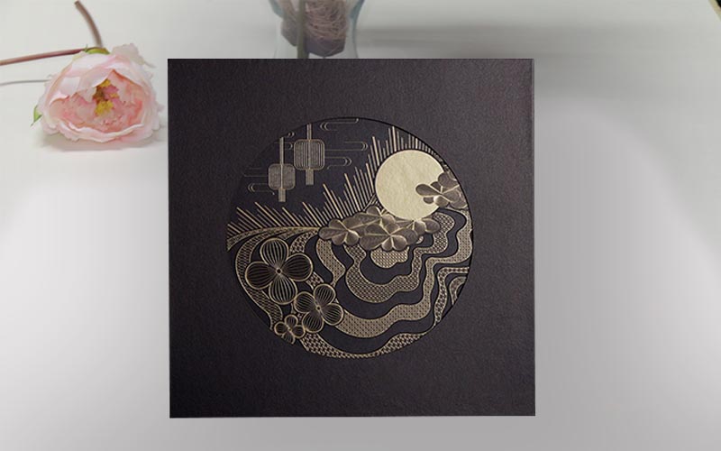 1.材質:.盒子面紙黑色珠光紙表面燙金文字,中間镂空圓形貼黑色特種紙燙金裱1300G灰闆镂空花型 ,盒子整體裱1500G雙灰闆盒型爲天地盒+内圍條。手工制作手提袋中國紅珠光紙簡單的燙金工藝。